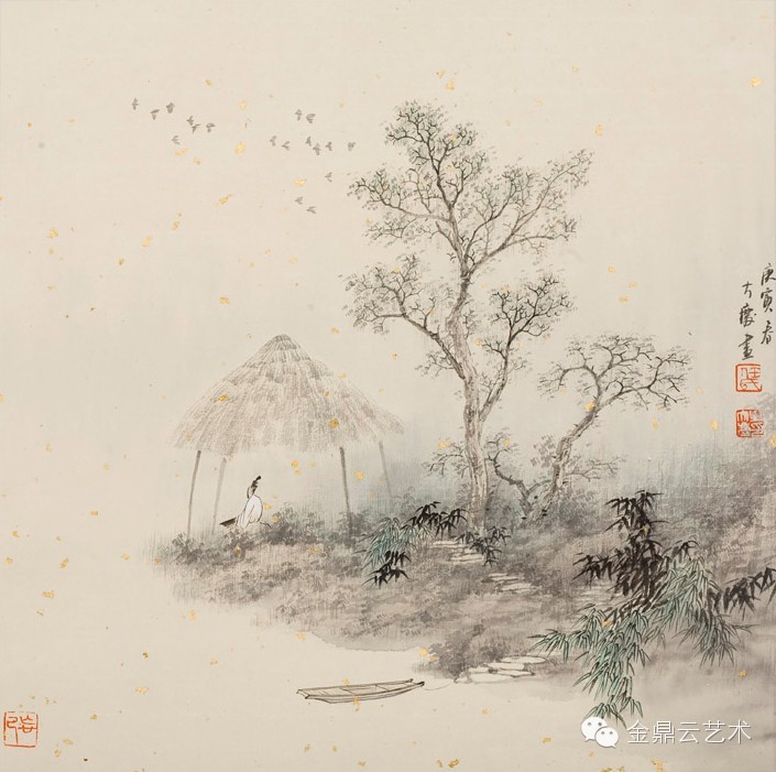 他的山水画充满了禅意,其画题及题语云:“四时读禅依山居”、“顿悟”、“人自安闲水自流”、“静观自得”、“静心可得之”、“清风本无价”、“清泉濯古柳”、“莲塘清浅静如练》”、“空寒萧疏”、“心轻万事淡物欲”、“山中无恼事,淡雅不知年”、“淡然无尘”、“思随青山远”等。闲、静、清、空、淡、远的深层意境,正是禅境的示现,这种禅境无疑是净化人们心灵的一帖清凉剂。孔六庆教授题其《丘园养素》阐释曰:“野渡无人的荒寒萧疏之景,古代画论说难状,难是难在有清、静、闲、淡的趣远之心,有之必含道映物、澄怀味象而畅神,于是自然而然产生笔墨也,大庆该图循此而得之。”